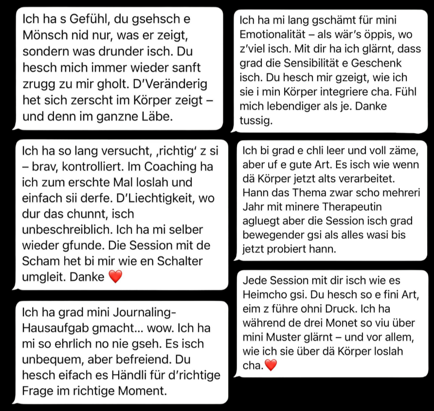 Wenn ich dir zuhöre, höre ich nicht nur deine Worte. Ich nehme wahr, was dein System flüstert, was dein Körper erzählt und was sich zwischen deinen Sätzen bewegt. Meine Stärke liegt darin, das Unsichtbare zu spüren, zwischen den Zeilen deines Körpers zu lesen und selbst das, was festzustecken scheint, sanft in Bewegung zu bringen.